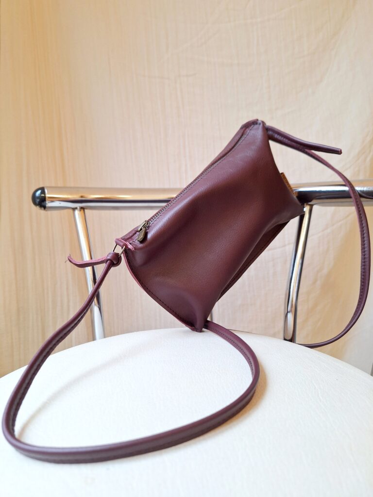 Schoudertasje van leer, in lengte verstelbare hengsels met knoop.